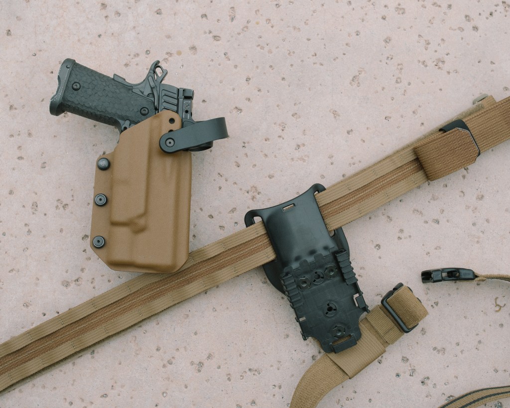 Currently if you are a 2011 shooter than you already know how shitty it is to find a holster that is out of the box that will fit your exact model 2011. I on the other hand get extra hosed because up until STI changed their name I have been shooting a STI DVC P ( 5 inch , full dust cover ) and that made it harder to find a RMR /X300 holster. Luckily when I first picked up this gun QVO who is local was able to turn out some kydex for me. Unfortunately for me his holster wasn’t on my belt long due to wanting to run retention. The retention dilemma lead me down another path to where I landed on a Long’s Shadow Customs holster. Without getting to far into detail on why the aftermarket bale on this setup sucks, it doesnt stay closed and no matter how much adjustment I would make it would still come down. Great holster shitty bale ( thanks aftermarket) . Needles to say I have been waiting for a while on something worth my time when it comes to a retention holster for my 2011.